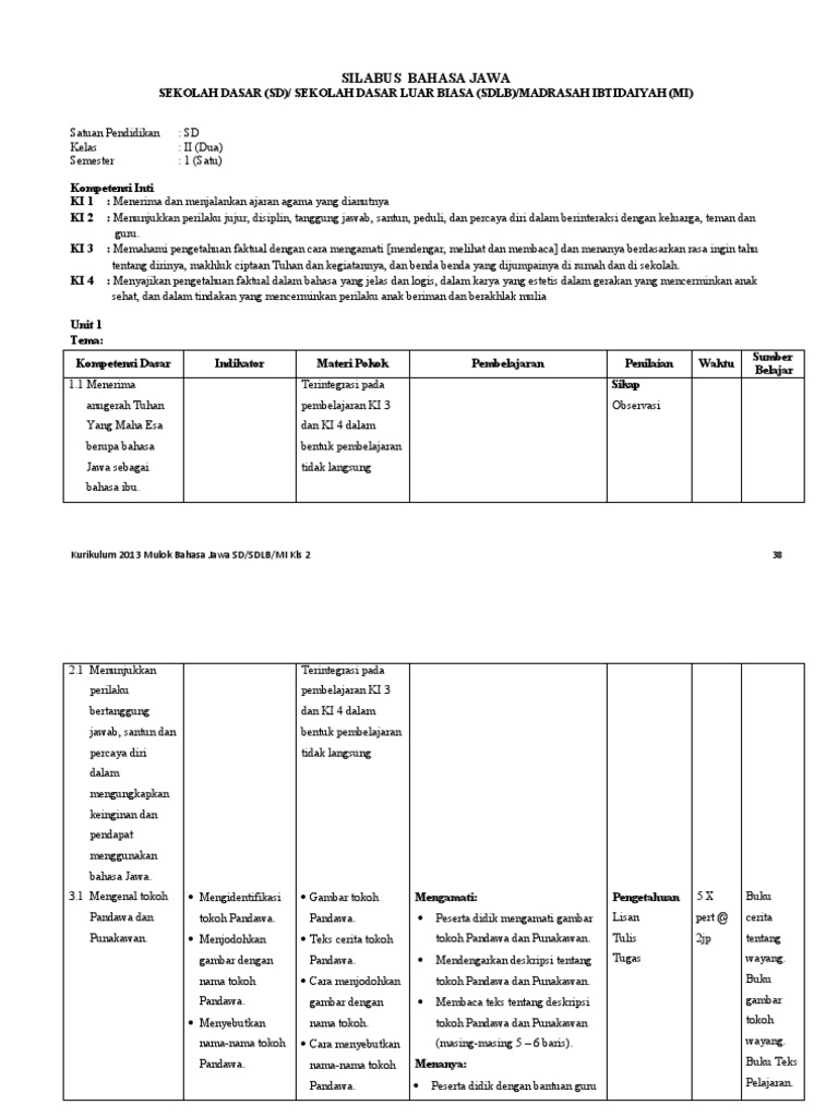 Silabus kelas iv semester genap k13 revisi 2017 ini dibuat berdasarkan buku kelas iv kurikulum 2013 revisi 2017 yang dapat dapat bapak dan ibu guru demikian silabus kelas 4 (iv) jenjang sd/mi semester 2/ genap kurikulum 2013 revisi terbaru yang bisa saya bagikan, semoga bermanfaat. Silabus bahasa jawa kelas 4 semester 1 dan 2. Silabus mulok bahasa sunda kurikulum 2013 untuk sd/mi, smp/mts, sma/ma/smk. Banyaknya orang jawa yang merantau ke malaysia turut membawa bahasa dan kebudayaan jawa ke malaysia, sehingga terdapat kawasan soal ulangan tengah semester 2 bahasa jawa kelas 4 sd. Kumpulan soal uas ips semester 2 kelas 1 2 3 4 5 sd dan kunci jawaban.